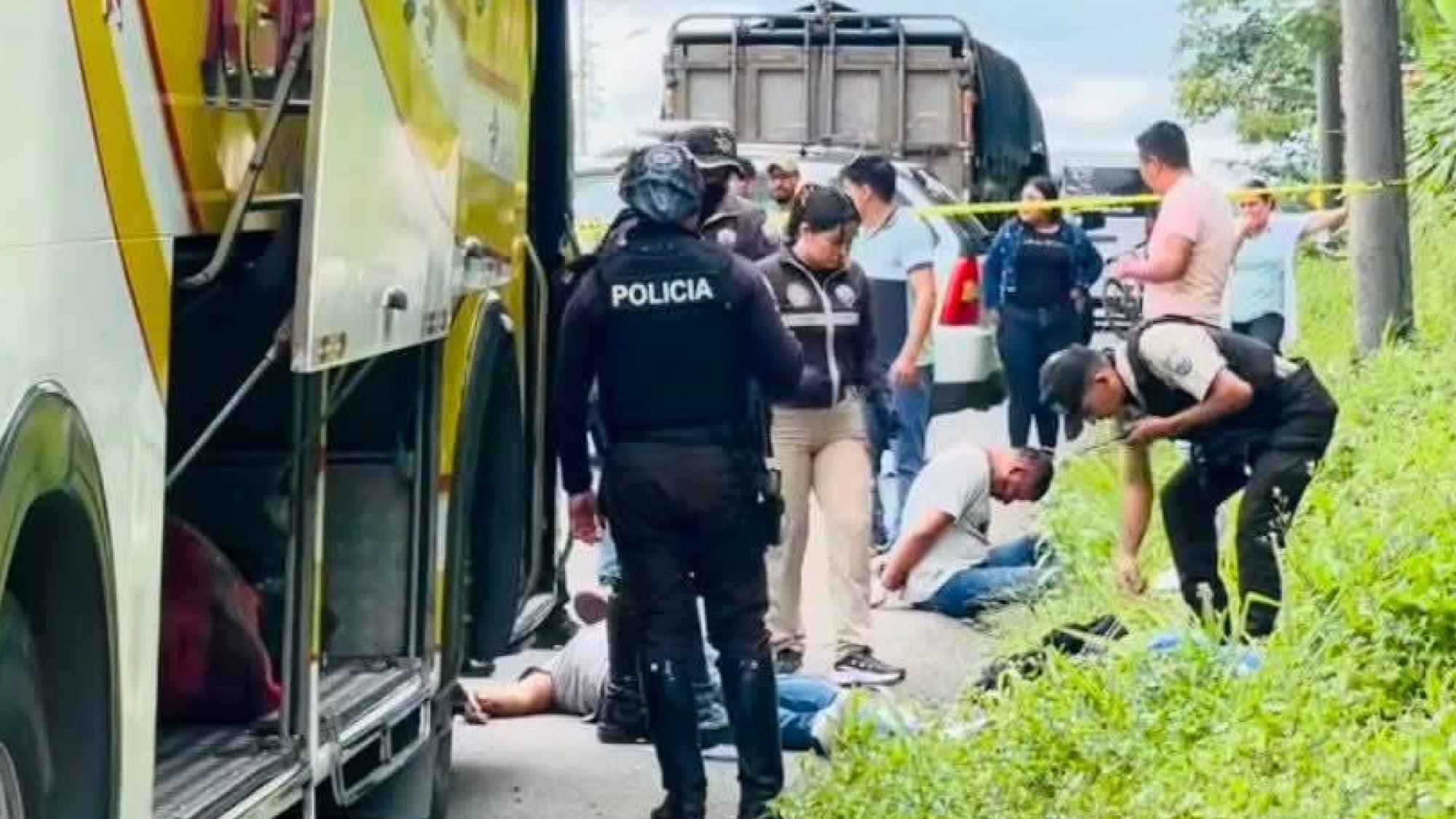 El ECU 911 coordinó la presencia de unidades especializadas tras la alerta de una persona fallecida por arma de fuego y un herido. Personal de la Dinased acudió al sitio para verificar el hecho. A un costado de la vía pública yacía el cuerpo sin signos vitales. El herido permanecía retenido por los pasajeros, quienes señalaron que ambos participaron en el robo a personas dentro del bus.