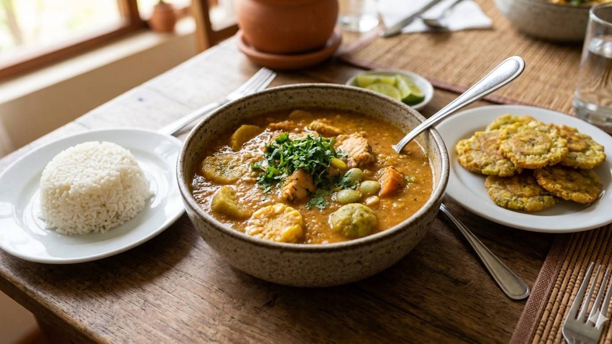 El sabor base se construye con un refrito de cebolla colorada, pimiento, ajo y achiote. Además, un elemento distintivo son las bolitas de plátano, hechas de ralladura de plátano verde mezclada con un poco de pasta de maní, que se cocinan directamente en el caldo.