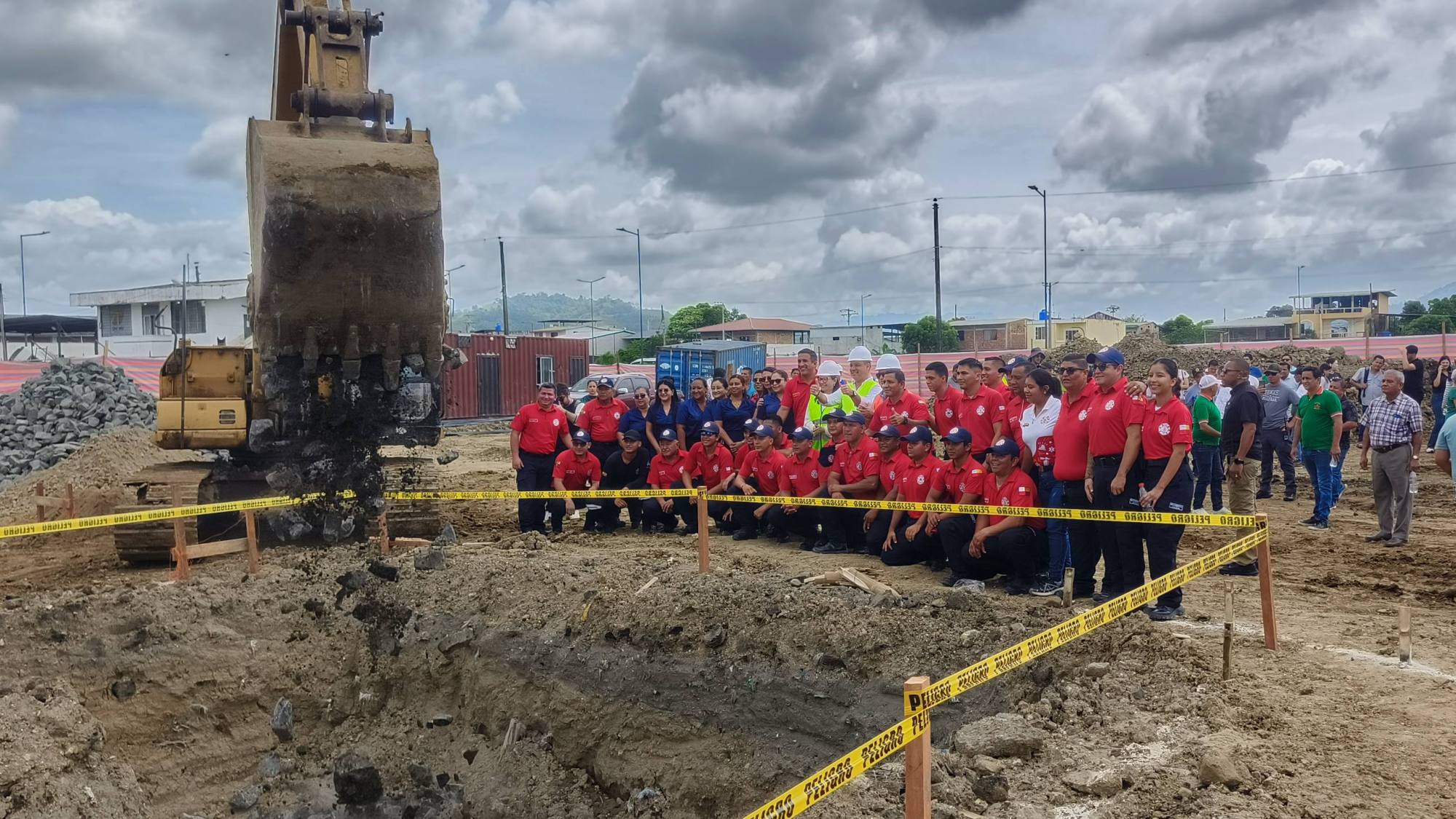 El alcalde Leonardo Rodríguez y autoridades locales colocaron la primera piedra del nuevo cuartel del Cuerpo de Bomberos de Chone. La obra se levanta en el paso lateral para saldar una deuda histórica tras las afectaciones del terremoto de 2016 en sus antiguas instalaciones.