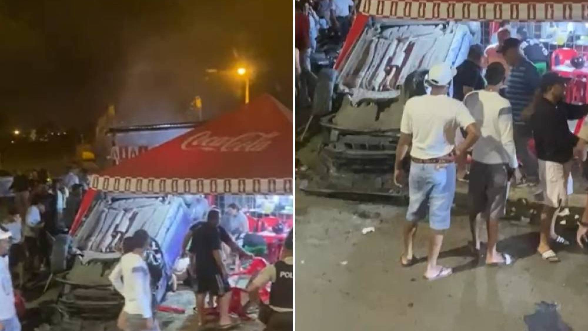 El estado en el que quedaron los vehículos refleja la violencia del choque, el cual no solo causó daños irreparables en las unidades de transporte, sino que también destruyó parte del mobiliario del local de comidas rápidas afectado.