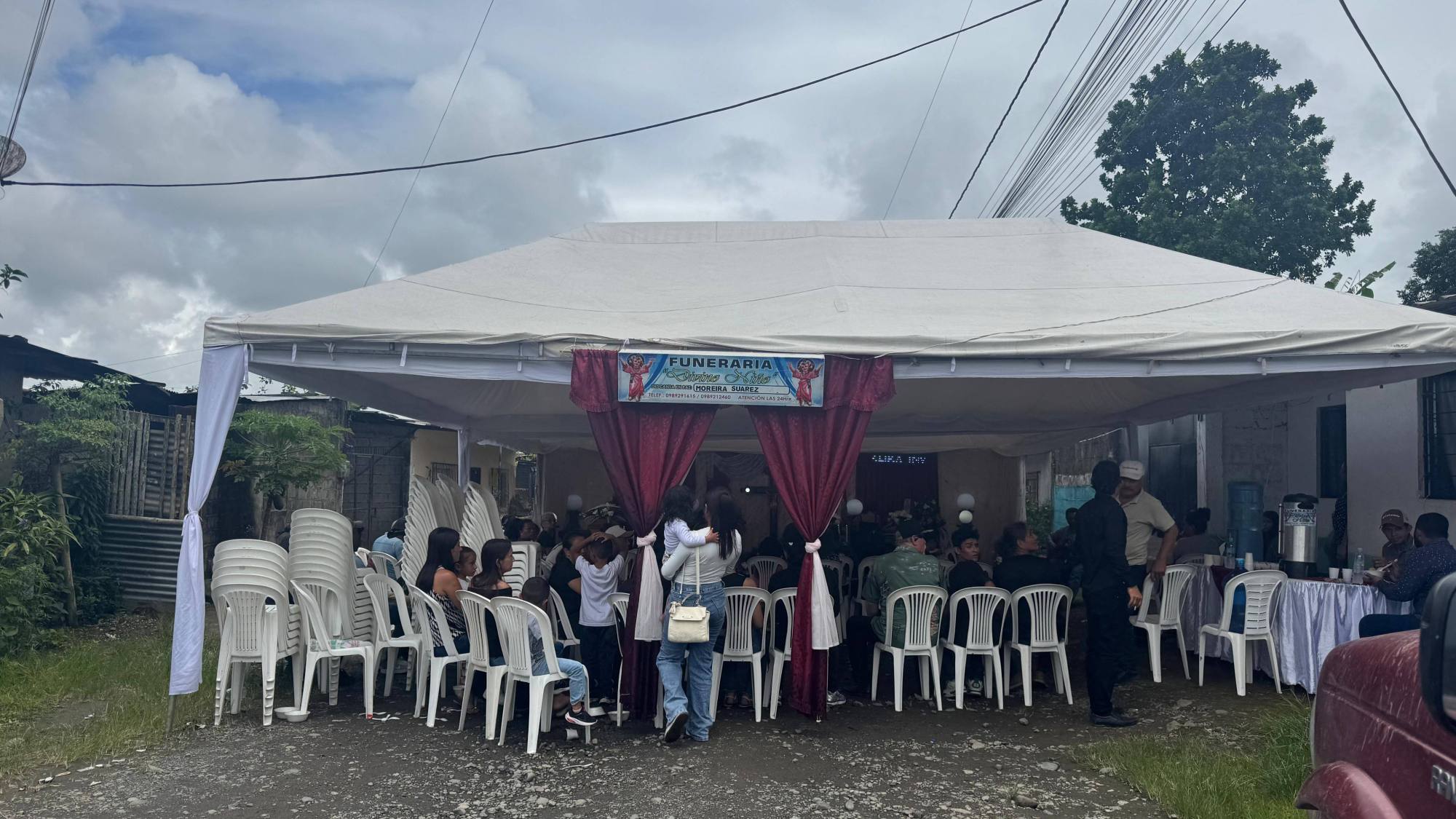 El velorio se realizó en el barrio Jaime Roldós Aguilera, parroquia San Jacinto del Búa, en Santo Domingo. Allí se reunieron familiares, amigos y vecinos para despedir a cuatro de las víctimas. Los ataúdes permanecieron juntos bajo una carpa funeraria instalada frente a la vivienda de sus familiares. El ambiente estuvo marcado por el silencio, los abrazos y el llanto.