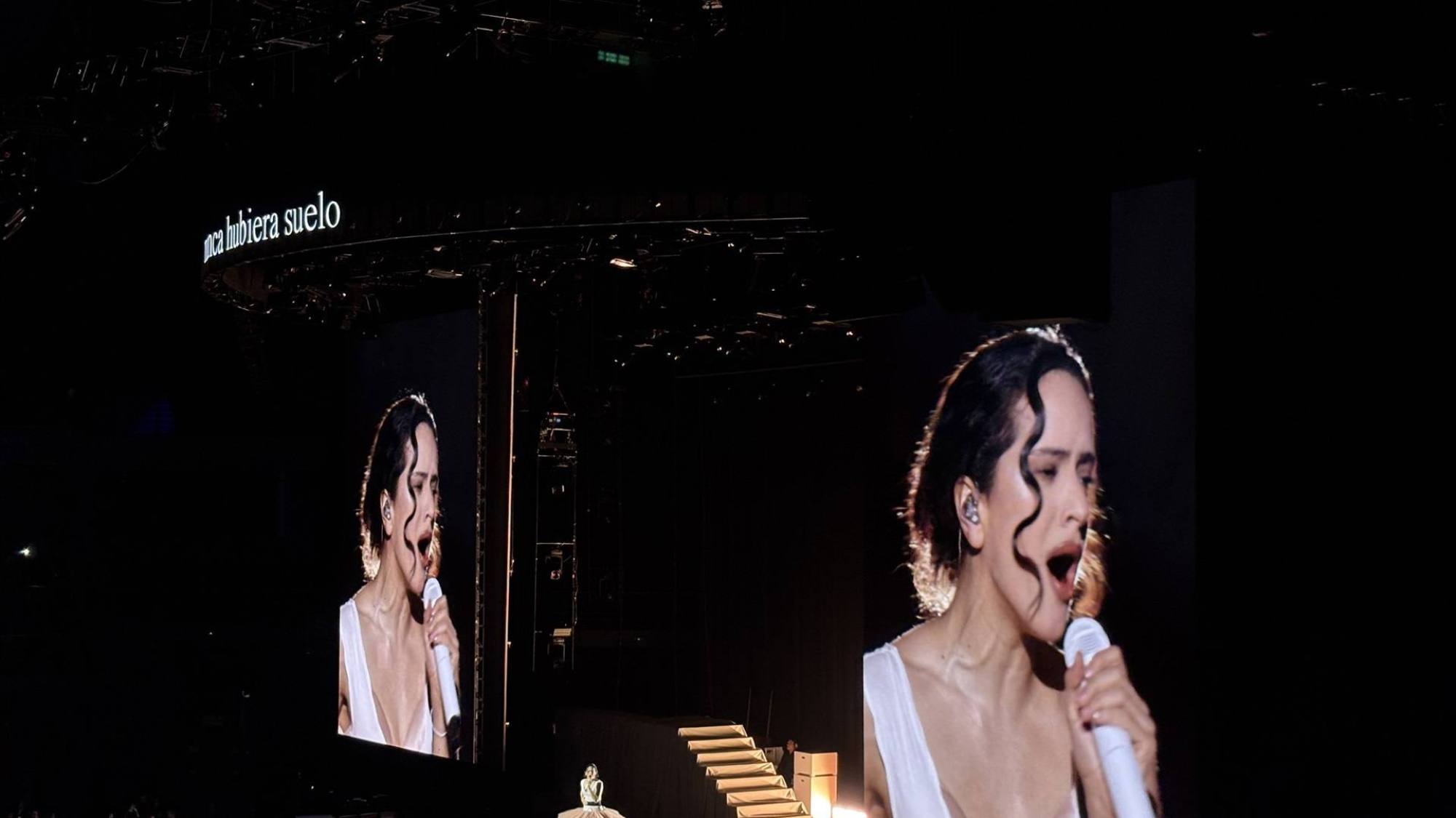 El concierto arrancó con una revelación dramática. Unas pantallas blancas, que simulaban el reverso de un cuadro con la firma de la artista y la palabra ‘Lux’, dieron paso a un ejército de bailarines que liberaron a Rosalía de una caja, presentándola en el centro como una bailarina de juguete. Enfundada en un tutú y zapatillas de punta rosas, la artista inició la velada con ‘Sexo, violencia y llantas’ y ‘Reliquia’, replicando fielmente el comienzo de su disco ‘Lux’. El recinto rugió con cada movimiento de sus bailarines dándole cuerda.