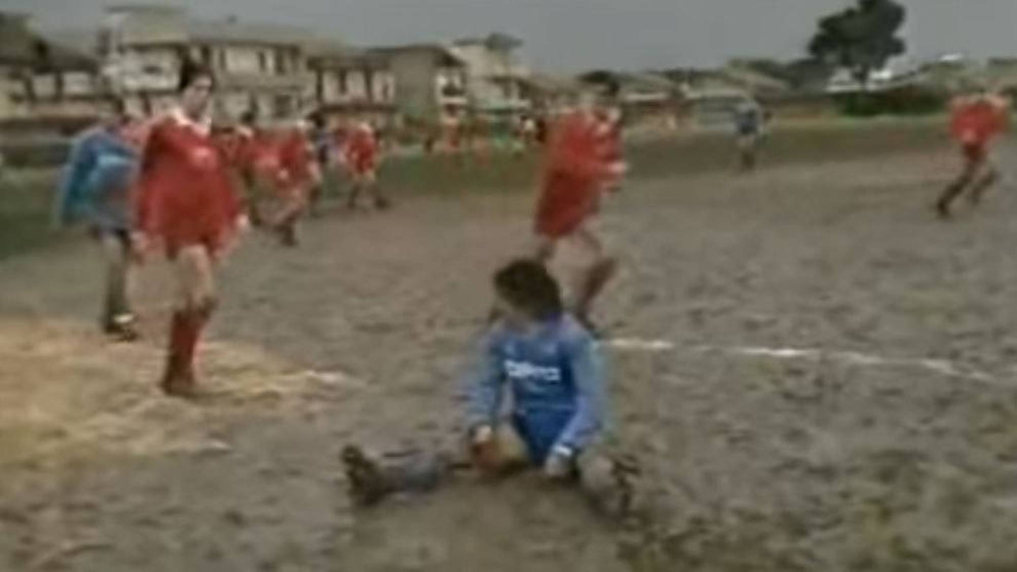 El 25 de enero de 1985, apenas un día después de un partido oficial, el equipo titular del Napoli aparece en el pequeño estadio de Acerra. No hay lujos. No hay cámaras internacionales. Solo una cancha convertida en lodazal, tribunas repletas de gente humilde y una esperanza que se juega en noventa minutos.