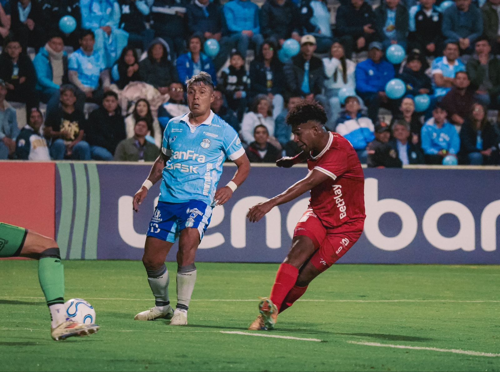 Durante los primeros minutos, el cuadro colombiano lateralizó su juego tratando de abrir los dos bloques defensivos de Macará que trató de cerrar las líneas de ataque. Intentó con jugadas de Mateo Castillo y Darwin Machis en busca de Daniel Valencia.