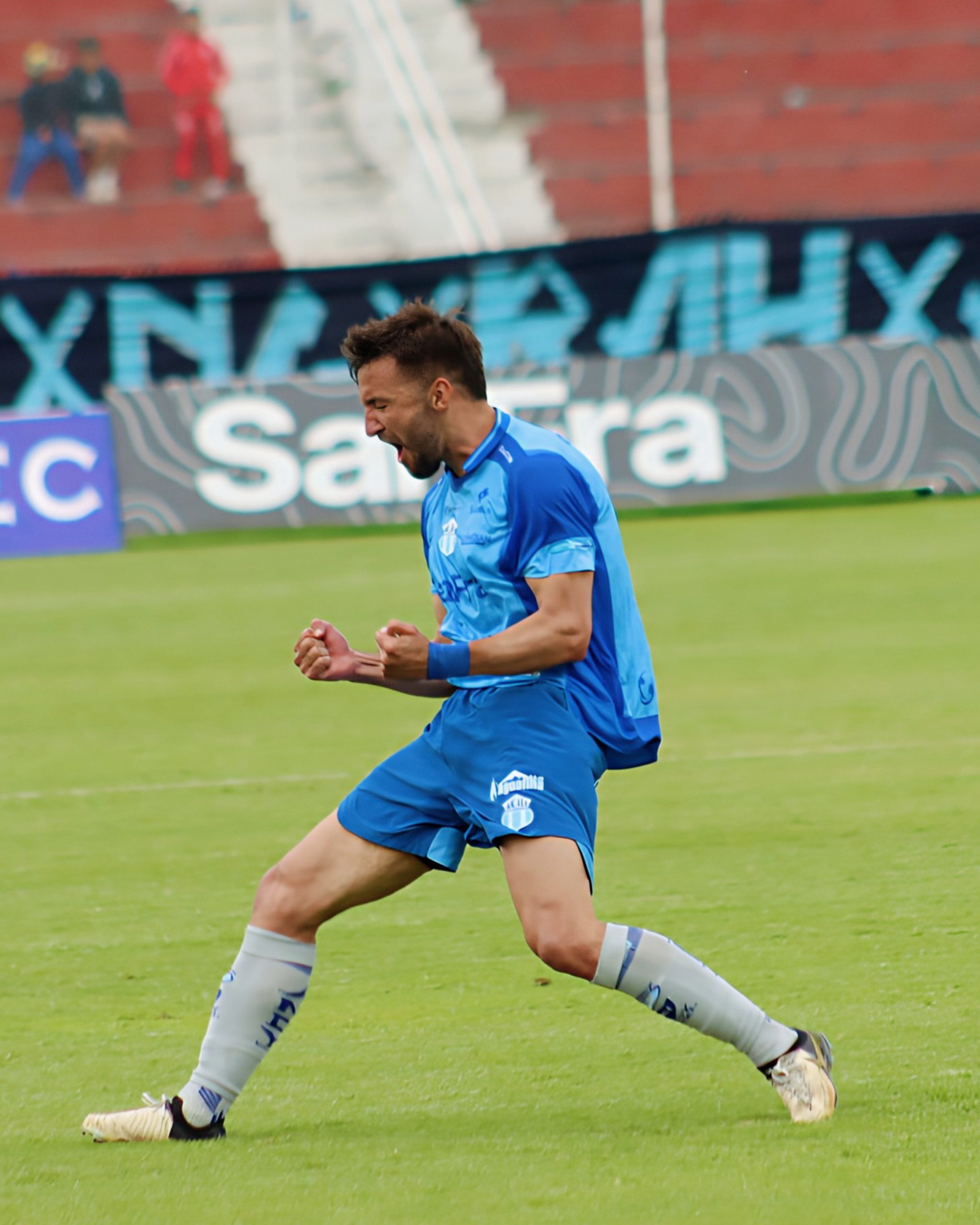 Gastón Blanc celebra la tercera anotación de Macará ante Delfín en el estadio Bellavista, un gol que reafirmó el gran momento celeste y mantiene vivo el sueño de regresar a Copa Sudamericana. (Foto @Macara_Oficial)