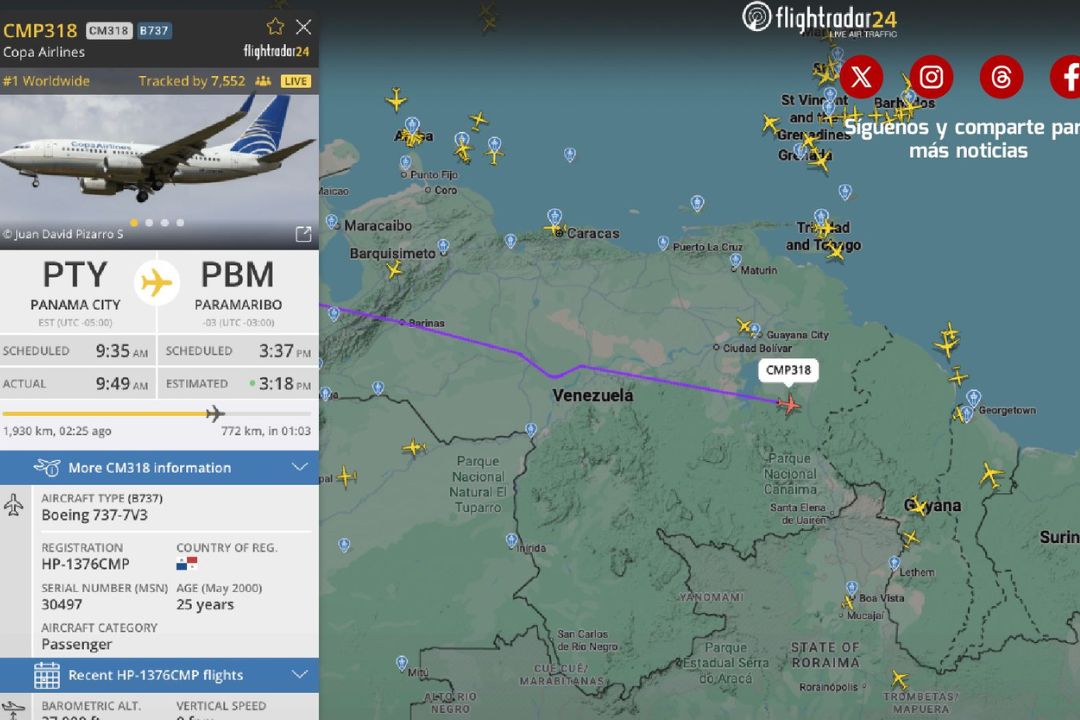Las páginas especializadas en monitoreo de vuelos mostraron la salida de un avión de la panameña, mostraron además el vuelo CMP318 de Copa Airlines, desde Panamá hacia Suriname, que usó el espacio aéreo venezolano, después del pronunciamiento de Trump en su red Truth Social.