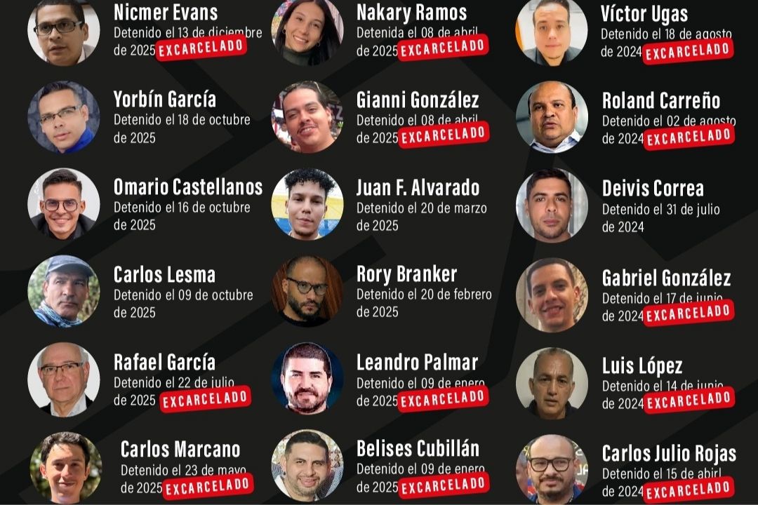 El SNTP señaló que también dejaron libres, aunque no se sabe sin con restricción de movimiento, a Carlos Marcano; apresado en mayo de 2025 y acusado por Cabello de una supuesta conspiración para impedir las elecciones regionales y parlamentarias del país; Víctor Ugas, al que detuvieron por pelear con un tiktoker afín al chavismo; a Roland Carreño, periodista y activista del partido opositor Voluntad Popular, a quien ya habían mantenido en prisión por tres años y lo volvieron a encarcelar en agosto de 2024.