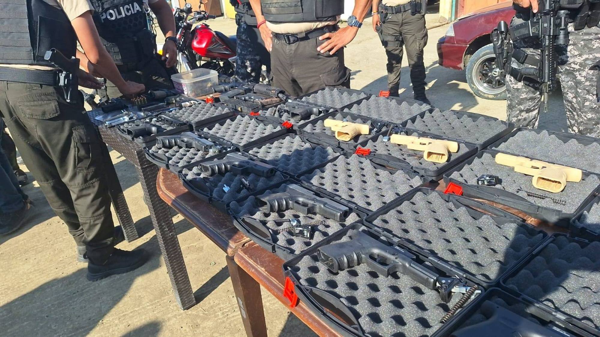 El caso involucra a Andrés Benjamín T.D., de 25 años, y a un adolescente de 16, quienes fueron capturados después de un allanamiento efectuado por la Policía Nacional. Según el informe oficial, el operativo se desarrolló en una vivienda donde, de acuerdo con información preliminar recopilada por las autoridades, el inmueble era utilizado como centro de acopio de armas del grupo criminal «Los Choneros». Esta vinculación está en proceso de verificación dentro de las fases siguientes de la investigación.