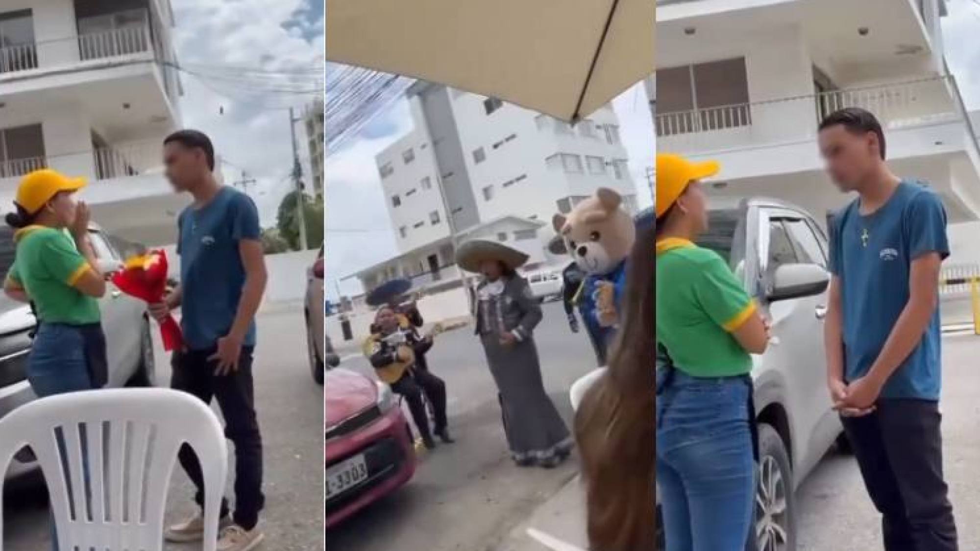 En las imágenes difundidas en plataformas digitales se observa al joven llegar con un ramo de flores y el acompañamiento musical de mariachis, con la intención de sorprender a la mujer. Sin embargo, la reacción de ella fue de rechazo hacia el gesto.